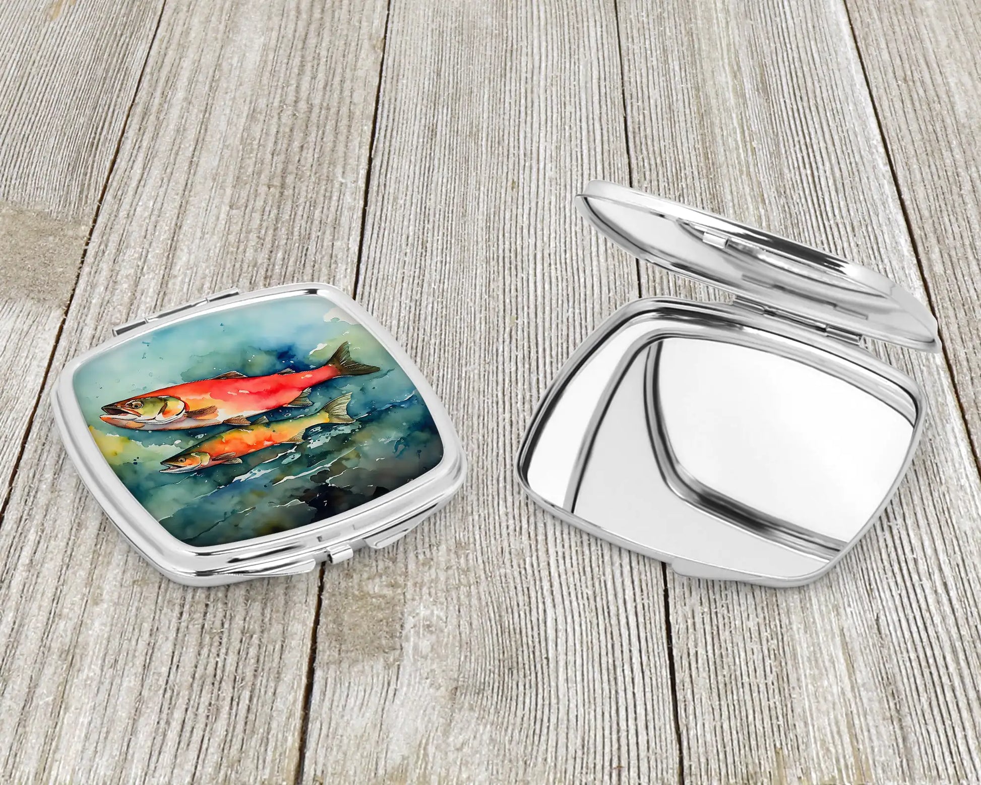 Compact Mirror featuring breed specific Salmon artwork. Introducing our Square Compact Mirror, a blend of elegance, functionality, and compactness, perfect for on-the-go touch-ups. This Silvertone metal mirror, with dimensions of 2.75 inches x 3 inches x .3 inches, fits effortlessly into your purse, handbag, or pocket, ensuring that you can check your appearance anytime, anywhere. Our compact mirror stands out with its eye-catching artwork on the front, adding a dash of style to this practical accessory. It is more than just a mirror; it's a statement piece that reflects your personality and aesthetic. When opened, this compact reveals two mirrors inside, doubling your perspective for precise touch-ups. The Silvertone metal construction ensures durability while maintaining a lightweight feel, making it an ideal everyday carry item. Whether you're rushing to a meeting, prepping for a dinner date, or just need a quick check on your look, our Square Compact Mirror is your reliable companion. Experience the perfect blend of style and practicality with this must-have accessory.
