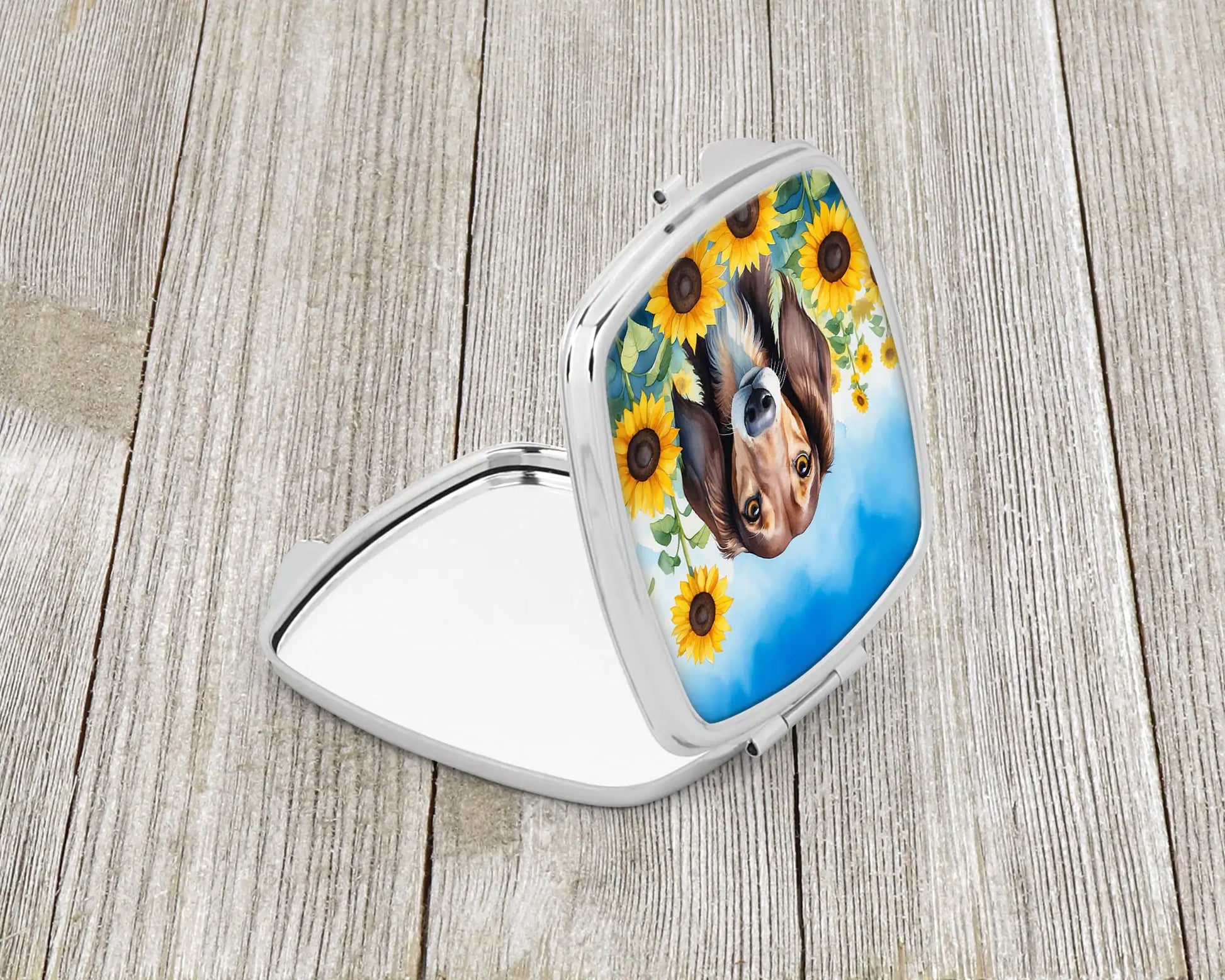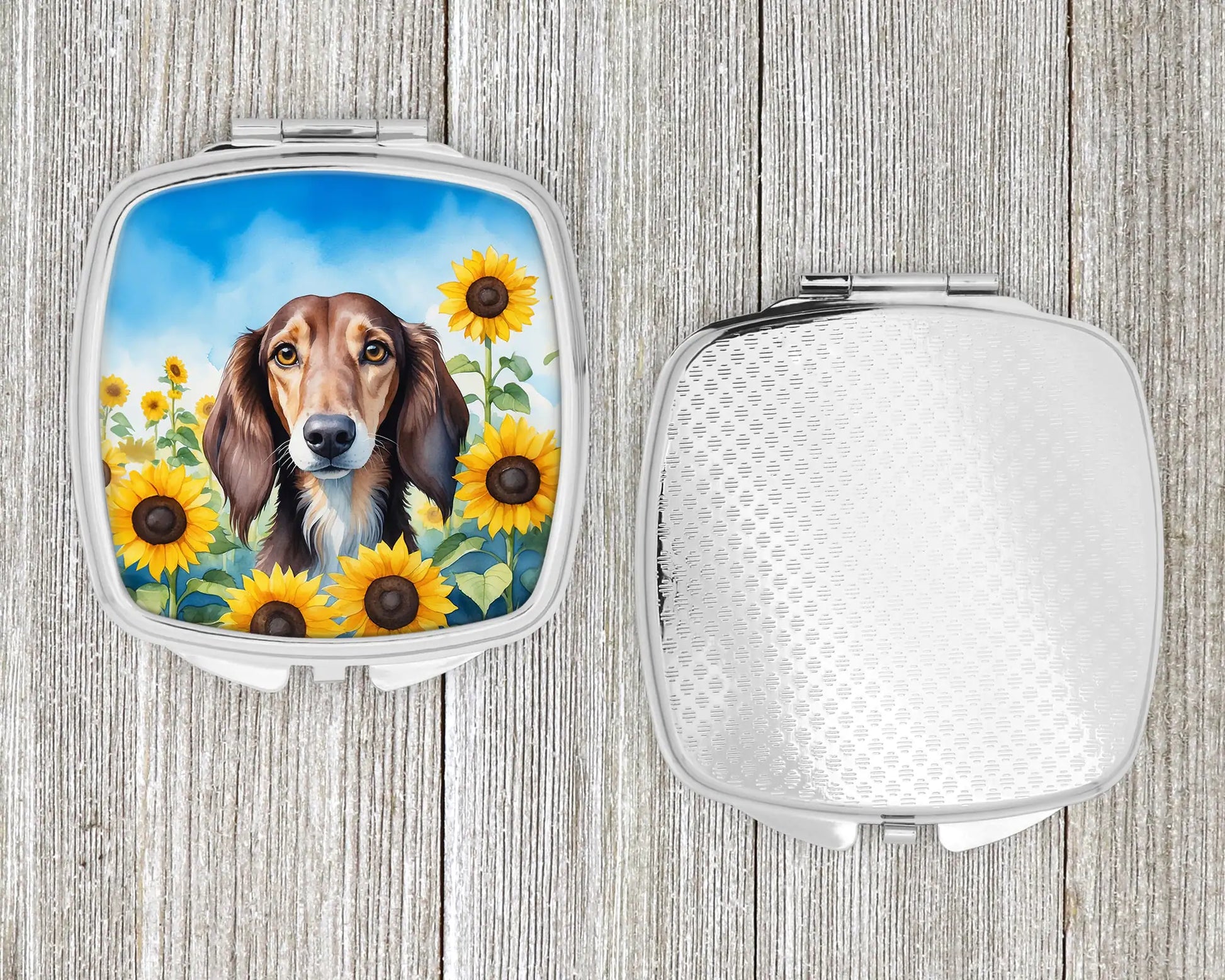 Compact Mirror featuring breed specific Saluki artwork. Introducing our Square Compact Mirror, a blend of elegance, functionality, and compactness, perfect for on-the-go touch-ups. This Silvertone metal mirror, with dimensions of 2.75 inches x 3 inches x .3 inches, fits effortlessly into your purse, handbag, or pocket, ensuring that you can check your appearance anytime, anywhere. Our compact mirror stands out with its eye-catching artwork on the front, adding a dash of style to this practical accessory. It is more than just a mirror; it's a statement piece that reflects your personality and aesthetic. When opened, this compact reveals two mirrors inside, doubling your perspective for precise touch-ups. The Silvertone metal construction ensures durability while maintaining a lightweight feel, making it an ideal everyday carry item. Whether you're rushing to a meeting, prepping for a dinner date, or just need a quick check on your look, our Square Compact Mirror is your reliable companion. Experience the perfect blend of style and practicality with this must-have accessory.