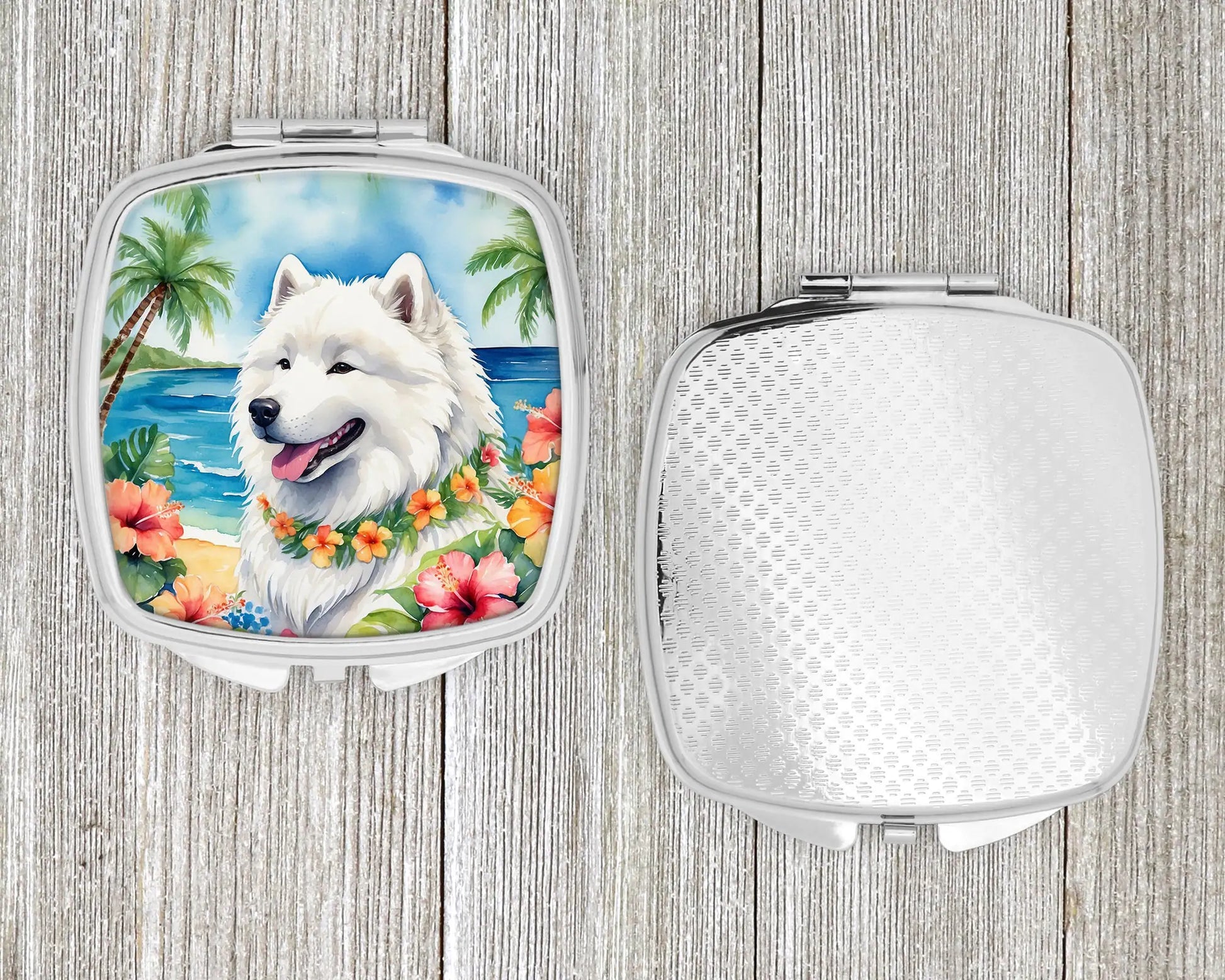 Compact Mirror featuring breed specific Samoyed artwork. Introducing our Square Compact Mirror, a blend of elegance, functionality, and compactness, perfect for on-the-go touch-ups. This Silvertone metal mirror, with dimensions of 2.75 inches x 3 inches x .3 inches, fits effortlessly into your purse, handbag, or pocket, ensuring that you can check your appearance anytime, anywhere. Our compact mirror stands out with its eye-catching artwork on the front, adding a dash of style to this practical accessory. It is more than just a mirror; it's a statement piece that reflects your personality and aesthetic. When opened, this compact reveals two mirrors inside, doubling your perspective for precise touch-ups. The Silvertone metal construction ensures durability while maintaining a lightweight feel, making it an ideal everyday carry item. Whether you're rushing to a meeting, prepping for a dinner date, or just need a quick check on your look, our Square Compact Mirror is your reliable companion. Experience the perfect blend of style and practicality with this must-have accessory.