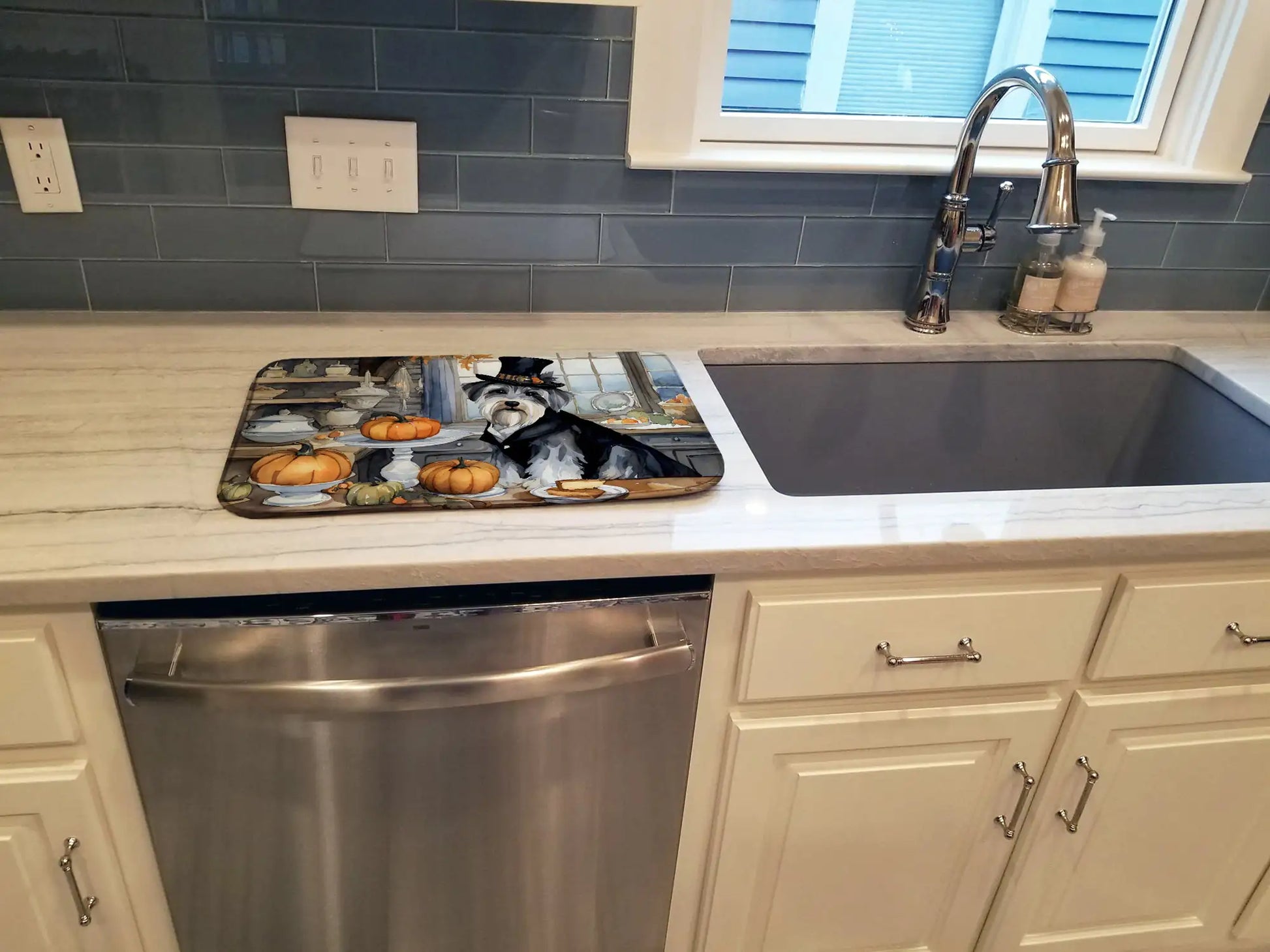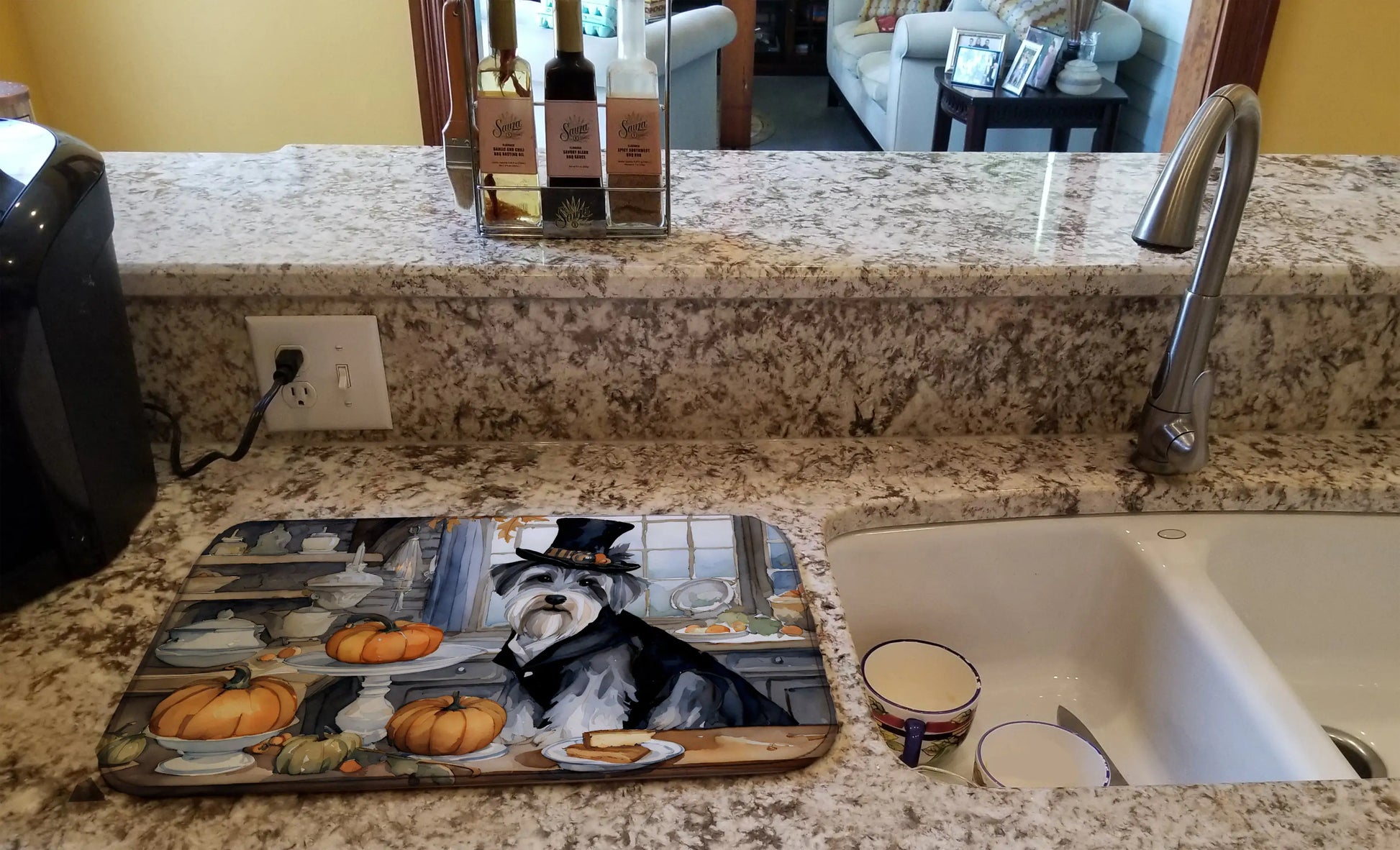 Dish Drying Mat featuring breed specific Schnauzer artwork. Celebrate Halloween with this Halloween Dish Drying Mat. Say goodbye to messy countertops and soggy dish towels with our innovative dish drying mat. Our high-quality dish drying pad is designed to keep your countertops dry while offering a stylish and efficient solution. Whether you're air drying dishes, glasses, stemware, silverware, pots, pans, bottles, or even fruits and vegetables, our dish mat is the perfect choice. The 14 inches x 22 inches size fits most counters and dish drying racks, and the non-slip design ensures stability. Made with water-absorbent polyester and a polyurethane foam insert, our dish drying mat is not only functional but also durable. It's machine washable and printed in the USA for long-lasting use. The beautiful artwork adds flair to your kitchen decor, making it a perfect housewarming gift or present for any occasion. Upgrade your kitchen experience with our absorbent and versatile dish drying mat.