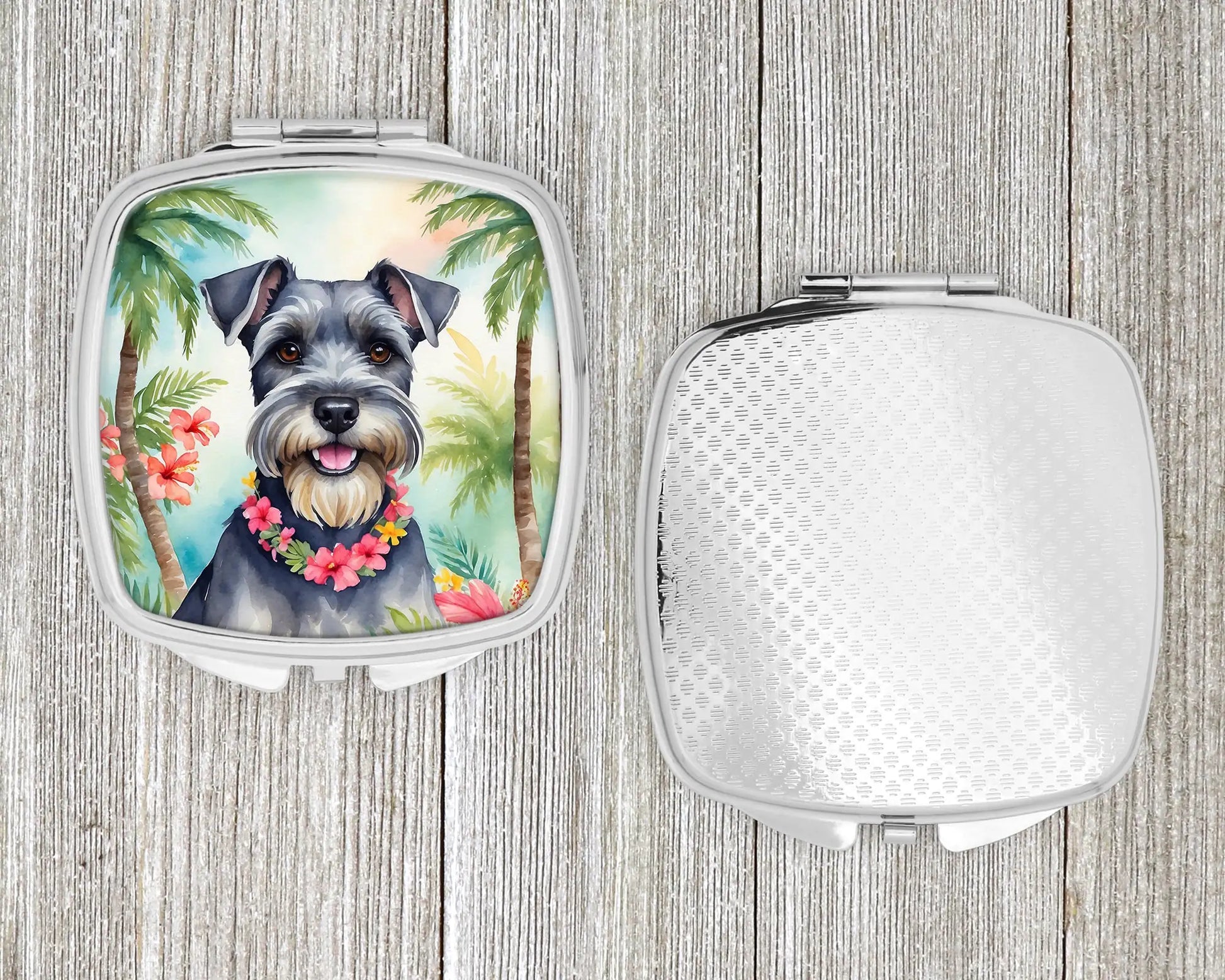 Compact Mirror featuring breed specific Schnauzer artwork. Introducing our Square Compact Mirror, a blend of elegance, functionality, and compactness, perfect for on-the-go touch-ups. This Silvertone metal mirror, with dimensions of 2.75 inches x 3 inches x .3 inches, fits effortlessly into your purse, handbag, or pocket, ensuring that you can check your appearance anytime, anywhere. Our compact mirror stands out with its eye-catching artwork on the front, adding a dash of style to this practical accessory. It is more than just a mirror; it's a statement piece that reflects your personality and aesthetic. When opened, this compact reveals two mirrors inside, doubling your perspective for precise touch-ups. The Silvertone metal construction ensures durability while maintaining a lightweight feel, making it an ideal everyday carry item. Whether you're rushing to a meeting, prepping for a dinner date, or just need a quick check on your look, our Square Compact Mirror is your reliable companion. Experience the perfect blend of style and practicality with this must-have accessory.