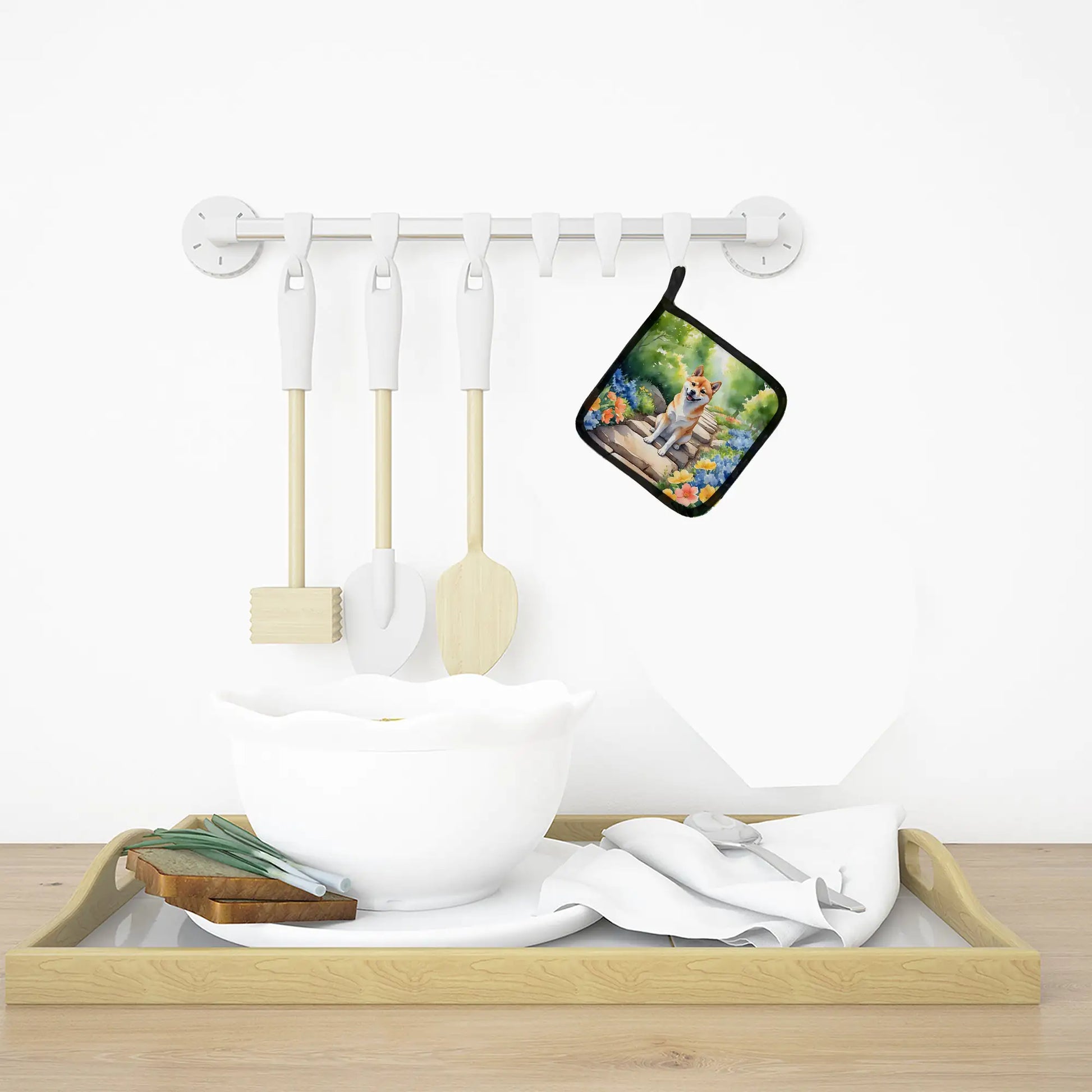 Pair of Pot Holders featuring breed specific Shiba Inu artwork. A Pair of Pot Holders to match your kitchen decor. Made in the USA these are thick and functional. Full color artwork decorates the front polyester fabric of the hot pad and accented by a black trim. Use these at as a trivet for your Thanksgiving or Christmas tablescape. Filled with insulated fabric and quilted for durability. These colorful pot holders will make a great gift for your favorite home cook or executive chef. Each pot holder measures approximately 7 1/2 inches by 7 1/2 inches. A hanging tab is included.