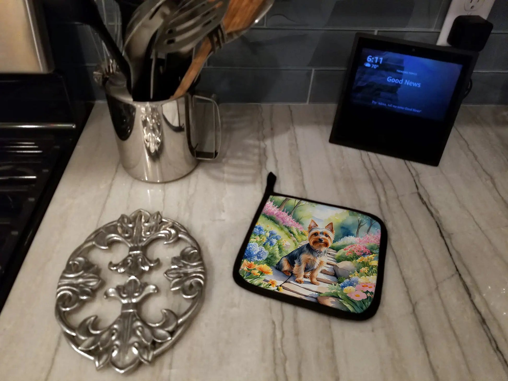 Pair of Pot Holders featuring breed specific Silky Terrier artwork. A Pair of Pot Holders to match your kitchen decor. Made in the USA these are thick and functional. Full color artwork decorates the front polyester fabric of the hot pad and accented by a black trim. Use these at as a trivet for your Thanksgiving or Christmas tablescape. Filled with insulated fabric and quilted for durability. These colorful pot holders will make a great gift for your favorite home cook or executive chef. Each pot holder measures approximately 7 1/2 inches by 7 1/2 inches. A hanging tab is included.