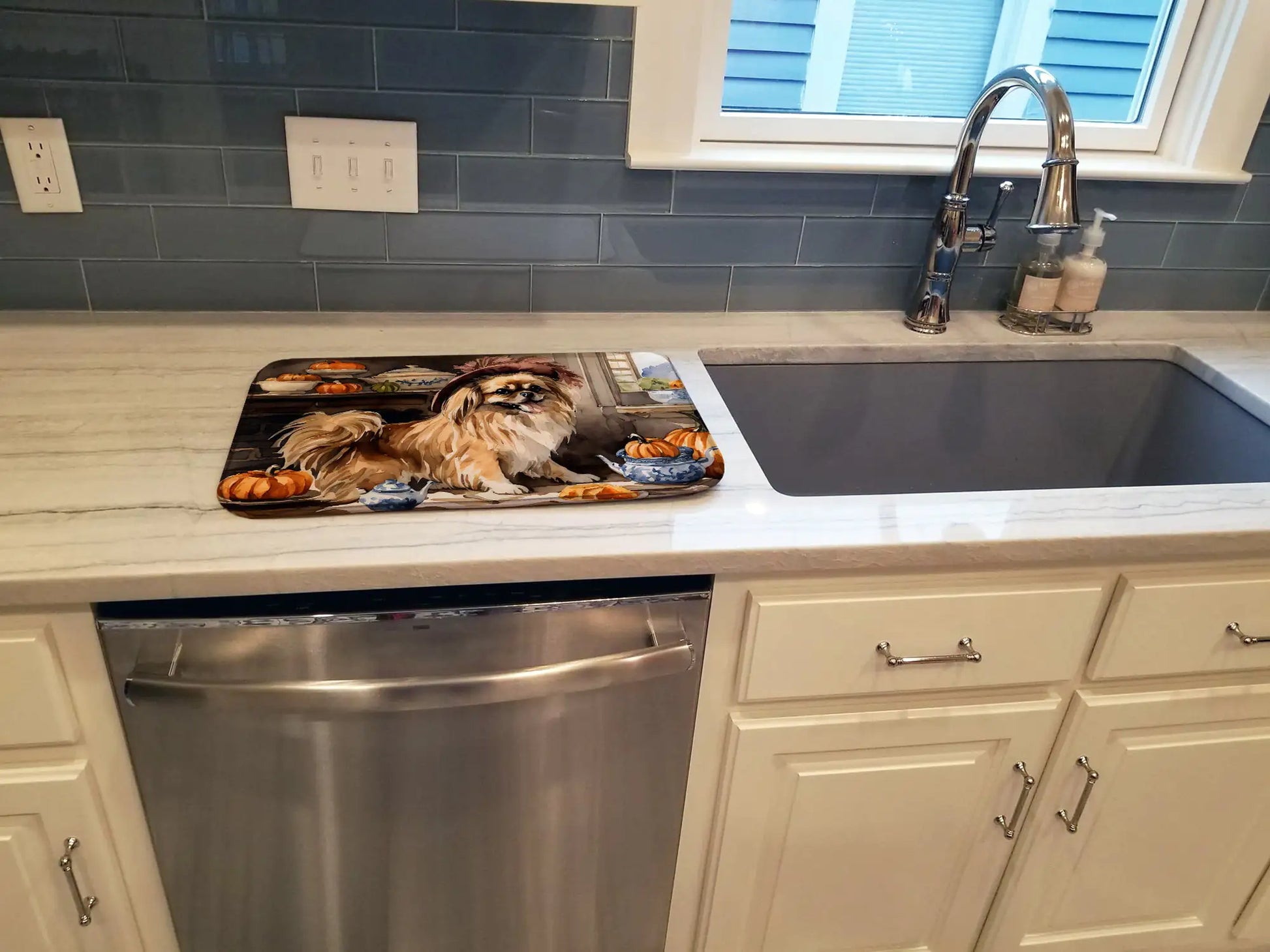 Dish Drying Mat featuring breed specific Tibetan Spaniel artwork. Celebrate Halloween with this Halloween Dish Drying Mat. Say goodbye to messy countertops and soggy dish towels with our innovative dish drying mat. Our high-quality dish drying pad is designed to keep your countertops dry while offering a stylish and efficient solution. Whether you're air drying dishes, glasses, stemware, silverware, pots, pans, bottles, or even fruits and vegetables, our dish mat is the perfect choice. The 14 inches x 22 inches size fits most counters and dish drying racks, and the non-slip design ensures stability. Made with water-absorbent polyester and a polyurethane foam insert, our dish drying mat is not only functional but also durable. It's machine washable and printed in the USA for long-lasting use. The beautiful artwork adds flair to your kitchen decor, making it a perfect housewarming gift or present for any occasion. Upgrade your kitchen experience with our absorbent and versatile dish drying mat.