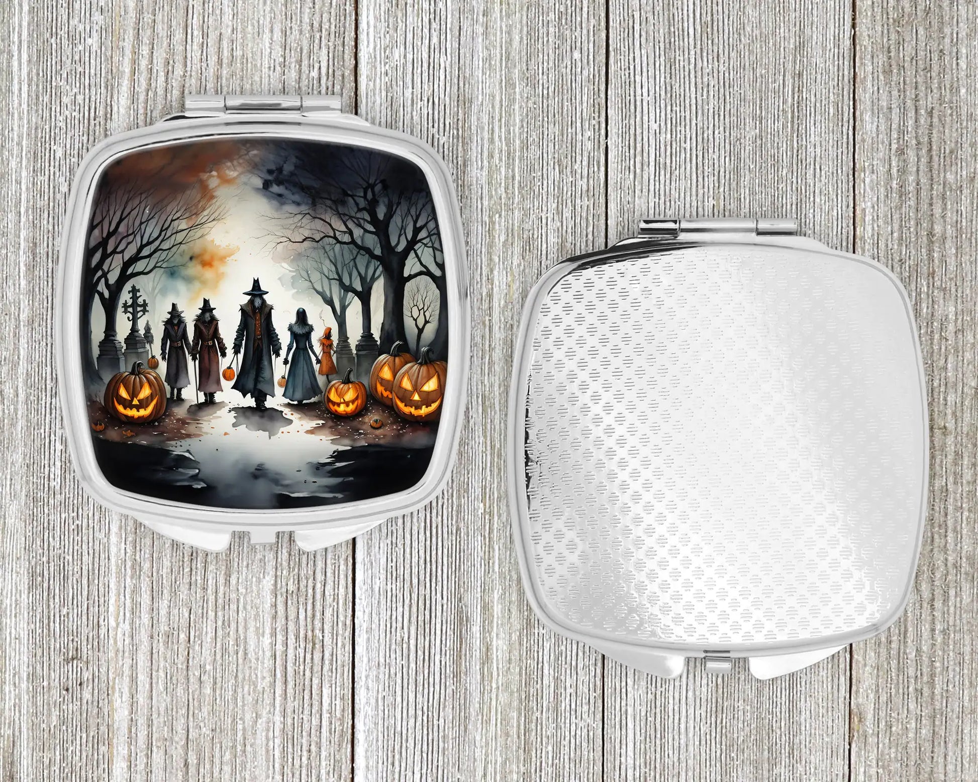 Celebrate Halloween with this Halloween Compact Mirror. Introducing our Square Compact Mirror, a blend of elegance, functionality, and compactness, perfect for on-the-go touch-ups. This Silvertone metal mirror, with dimensions of 2.75 inches x 3 inches x .3 inches, fits effortlessly into your purse, handbag, or pocket, ensuring that you can check your appearance anytime, anywhere. Our compact mirror stands out with its eye-catching artwork on the front, adding a dash of style to this practical accessory. It is more than just a mirror; it's a statement piece that reflects your personality and aesthetic. When opened, this compact reveals two mirrors inside, doubling your perspective for precise touch-ups. The Silvertone metal construction ensures durability while maintaining a lightweight feel, making it an ideal everyday carry item. Whether you're rushing to a meeting, prepping for a dinner date, or just need a quick check on your look, our Square Compact Mirror is your reliable companion. Experience the perfect blend of style and practicality with this must-have accessory.