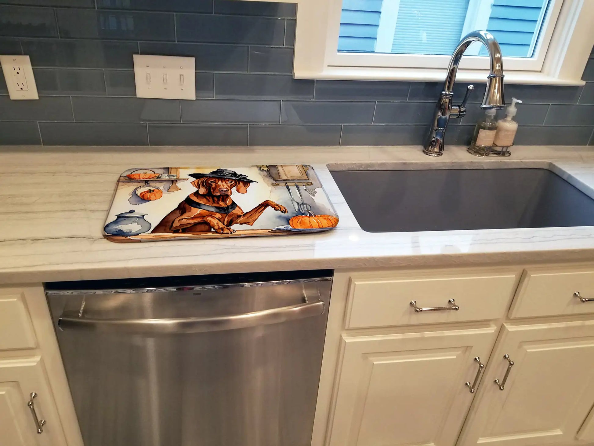 Dish Drying Mat featuring breed specific Vizsla artwork. Celebrate Halloween with this Halloween Dish Drying Mat. Say goodbye to messy countertops and soggy dish towels with our innovative dish drying mat. Our high-quality dish drying pad is designed to keep your countertops dry while offering a stylish and efficient solution. Whether you're air drying dishes, glasses, stemware, silverware, pots, pans, bottles, or even fruits and vegetables, our dish mat is the perfect choice. The 14 inches x 22 inches size fits most counters and dish drying racks, and the non-slip design ensures stability. Made with water-absorbent polyester and a polyurethane foam insert, our dish drying mat is not only functional but also durable. It's machine washable and printed in the USA for long-lasting use. The beautiful artwork adds flair to your kitchen decor, making it a perfect housewarming gift or present for any occasion. Upgrade your kitchen experience with our absorbent and versatile dish drying mat.