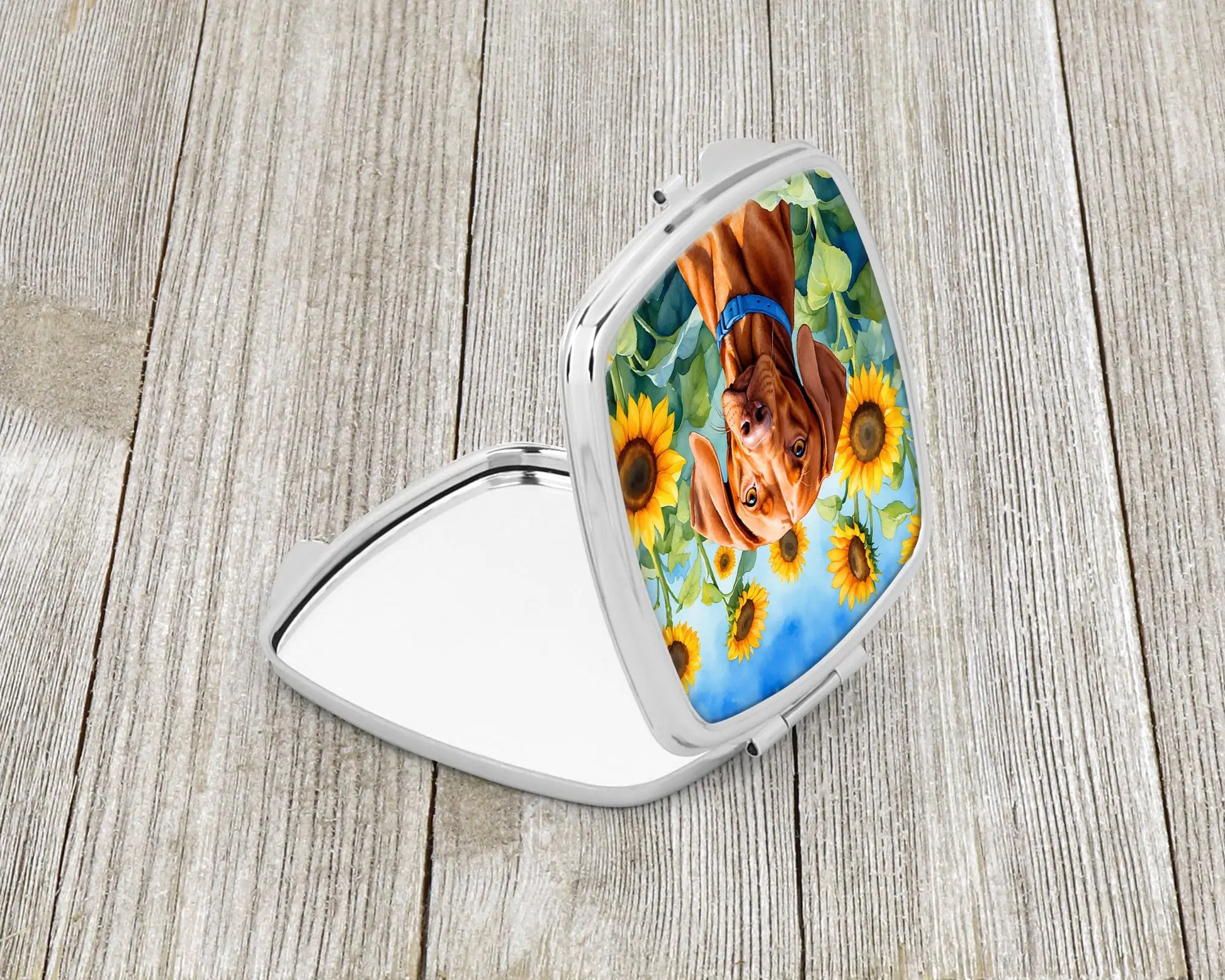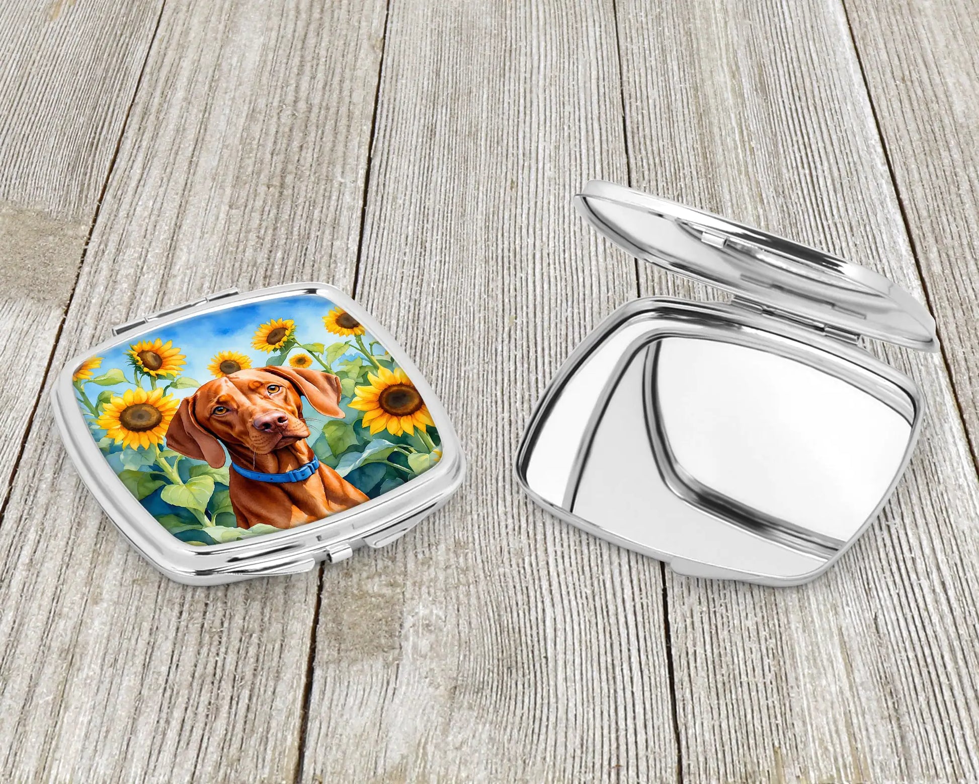Compact Mirror featuring breed specific Vizsla artwork. Introducing our Square Compact Mirror, a blend of elegance, functionality, and compactness, perfect for on-the-go touch-ups. This Silvertone metal mirror, with dimensions of 2.75 inches x 3 inches x .3 inches, fits effortlessly into your purse, handbag, or pocket, ensuring that you can check your appearance anytime, anywhere. Our compact mirror stands out with its eye-catching artwork on the front, adding a dash of style to this practical accessory. It is more than just a mirror; it's a statement piece that reflects your personality and aesthetic. When opened, this compact reveals two mirrors inside, doubling your perspective for precise touch-ups. The Silvertone metal construction ensures durability while maintaining a lightweight feel, making it an ideal everyday carry item. Whether you're rushing to a meeting, prepping for a dinner date, or just need a quick check on your look, our Square Compact Mirror is your reliable companion. Experience the perfect blend of style and practicality with this must-have accessory.