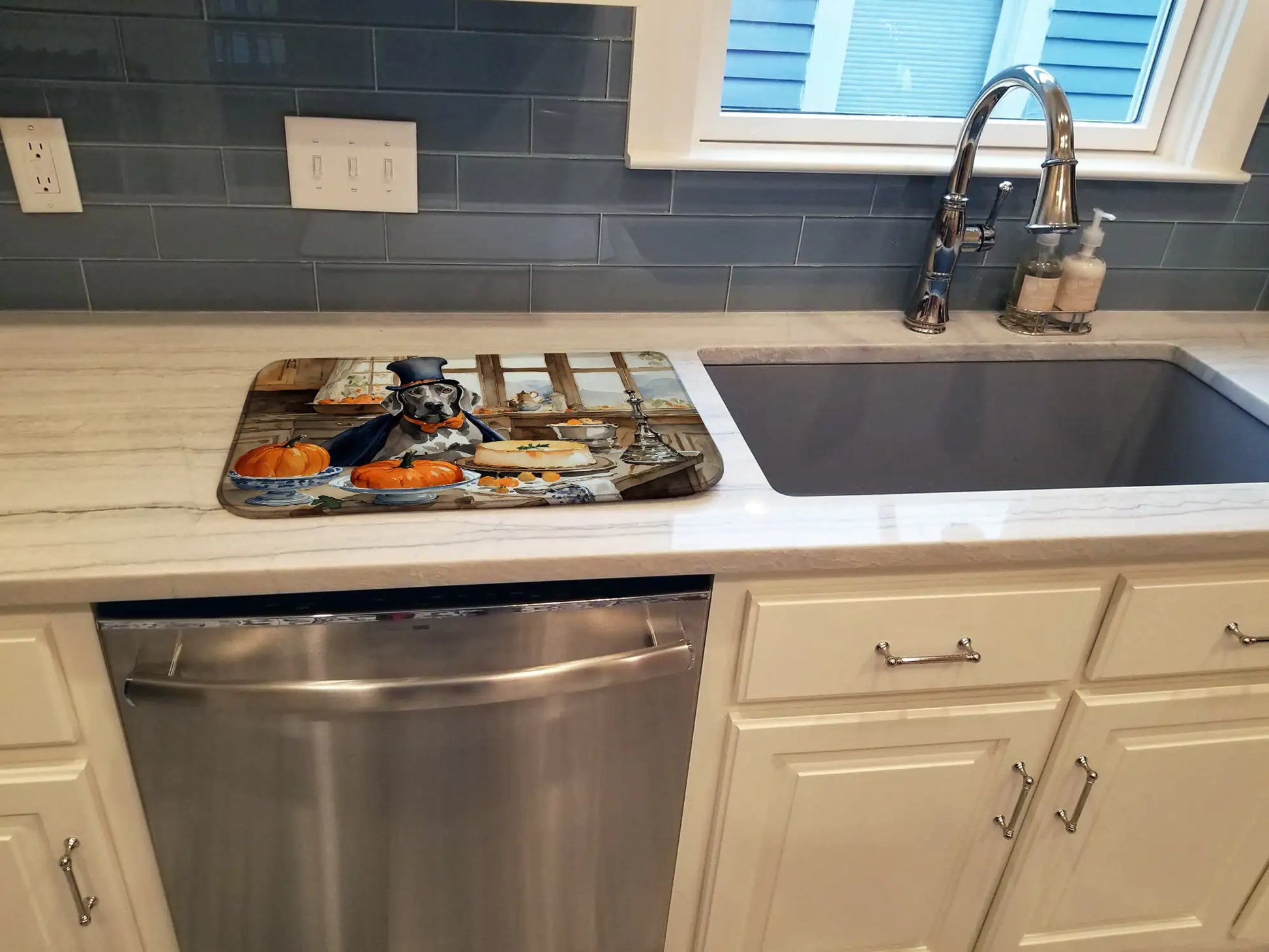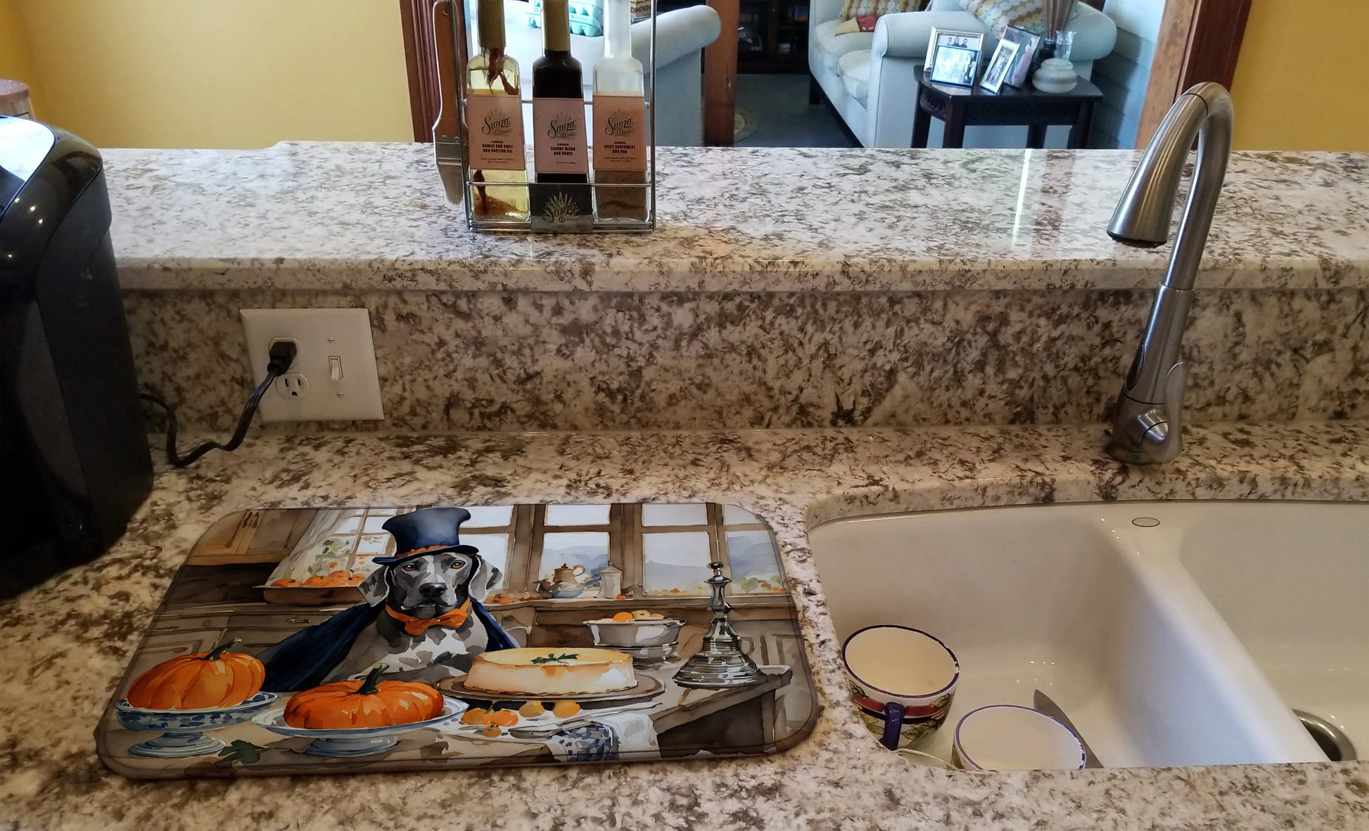 Dish Drying Mat featuring breed specific Weimaraner artwork. Celebrate Halloween with this Halloween Dish Drying Mat. Say goodbye to messy countertops and soggy dish towels with our innovative dish drying mat. Our high-quality dish drying pad is designed to keep your countertops dry while offering a stylish and efficient solution. Whether you're air drying dishes, glasses, stemware, silverware, pots, pans, bottles, or even fruits and vegetables, our dish mat is the perfect choice. The 14 inches x 22 inches size fits most counters and dish drying racks, and the non-slip design ensures stability. Made with water-absorbent polyester and a polyurethane foam insert, our dish drying mat is not only functional but also durable. It's machine washable and printed in the USA for long-lasting use. The beautiful artwork adds flair to your kitchen decor, making it a perfect housewarming gift or present for any occasion. Upgrade your kitchen experience with our absorbent and versatile dish drying mat.