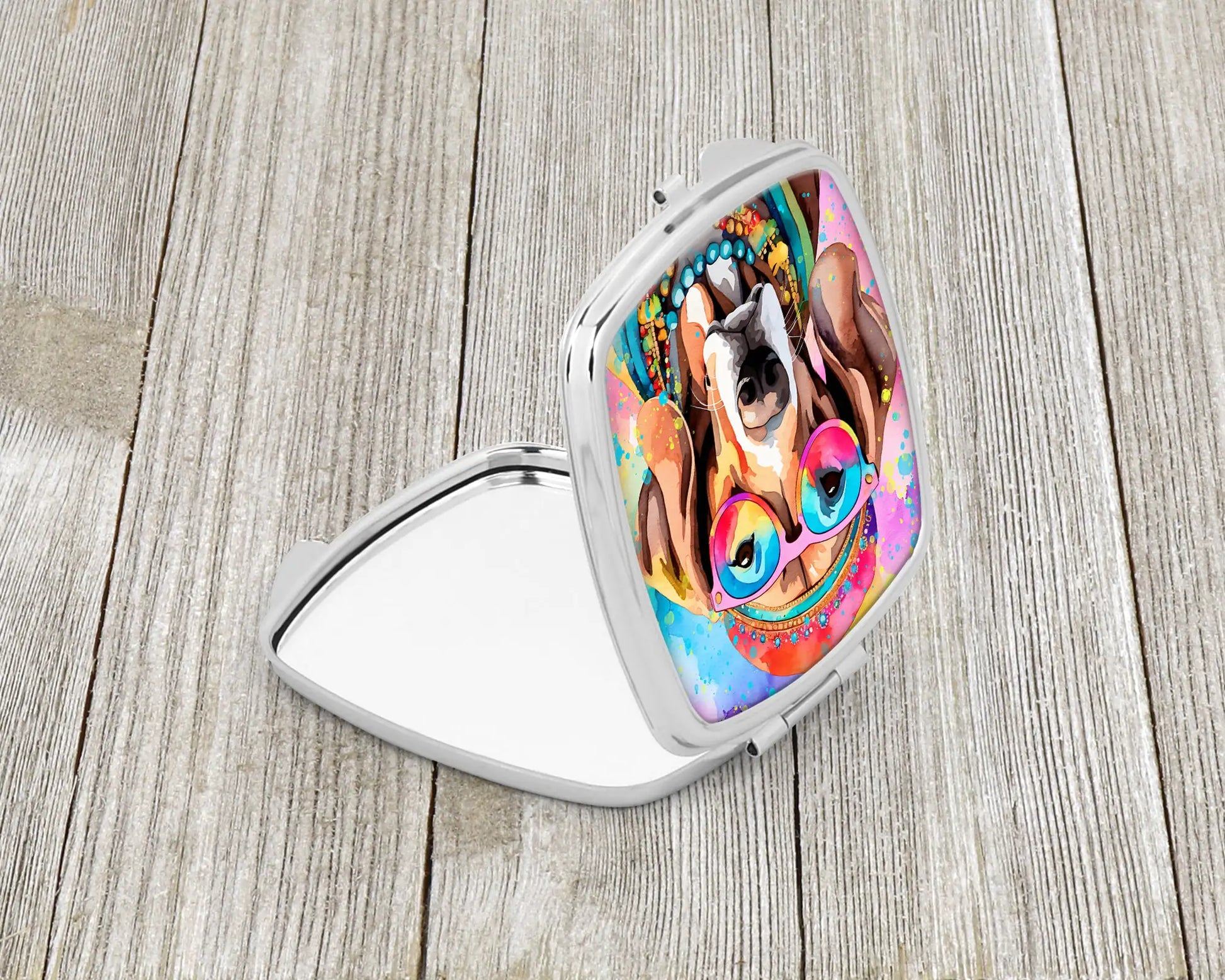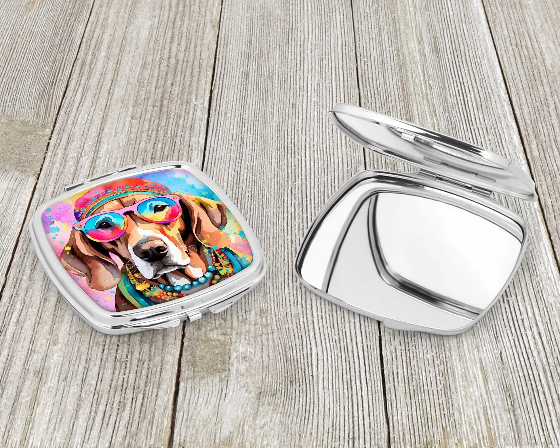 Compact Mirror featuring breed specific Weimaraner artwork. Introducing our Square Compact Mirror, a blend of elegance, functionality, and compactness, perfect for on-the-go touch-ups. This Silvertone metal mirror, with dimensions of 2.75 inches x 3 inches x .3 inches, fits effortlessly into your purse, handbag, or pocket, ensuring that you can check your appearance anytime, anywhere. Our compact mirror stands out with its eye-catching artwork on the front, adding a dash of style to this practical accessory. It is more than just a mirror; it's a statement piece that reflects your personality and aesthetic. When opened, this compact reveals two mirrors inside, doubling your perspective for precise touch-ups. The Silvertone metal construction ensures durability while maintaining a lightweight feel, making it an ideal everyday carry item. Whether you're rushing to a meeting, prepping for a dinner date, or just need a quick check on your look, our Square Compact Mirror is your reliable companion. Experience the perfect blend of style and practicality with this must-have accessory.