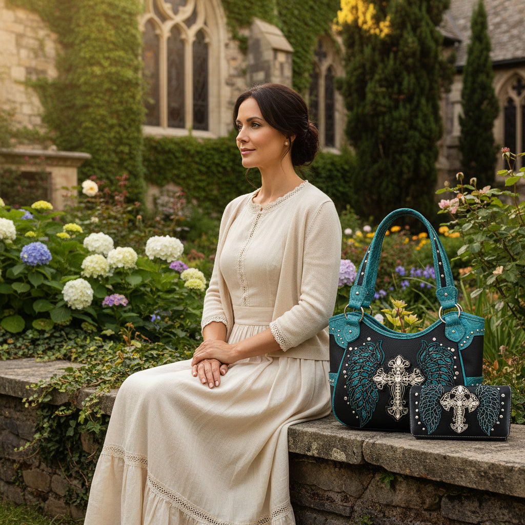 Western Style Rhinestone Cross Studded Laser Cut Wings Tooled Leather Purse Women Handbags Country Shoulder Bag Wallet Set (Black/Turq Set)