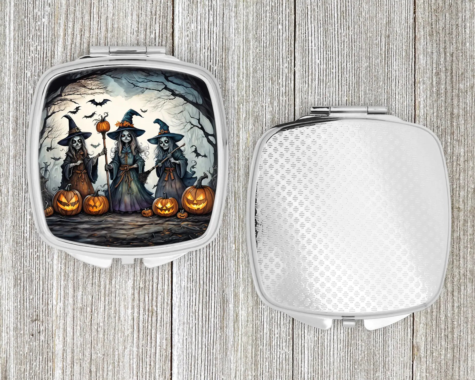 Celebrate Halloween with this Halloween Compact Mirror. Introducing our Square Compact Mirror, a blend of elegance, functionality, and compactness, perfect for on-the-go touch-ups. This Silvertone metal mirror, with dimensions of 2.75 inches x 3 inches x .3 inches, fits effortlessly into your purse, handbag, or pocket, ensuring that you can check your appearance anytime, anywhere. Our compact mirror stands out with its eye-catching artwork on the front, adding a dash of style to this practical accessory. It is more than just a mirror; it's a statement piece that reflects your personality and aesthetic. When opened, this compact reveals two mirrors inside, doubling your perspective for precise touch-ups. The Silvertone metal construction ensures durability while maintaining a lightweight feel, making it an ideal everyday carry item. Whether you're rushing to a meeting, prepping for a dinner date, or just need a quick check on your look, our Square Compact Mirror is your reliable companion. Experience the perfect blend of style and practicality with this must-have accessory.